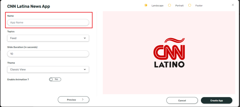 1. Go to the 'Apps' module. 2. Search for the CNN news app using the search field. 3. Hover over the app thumbnail and click on the Create App button. 4. Enter Name for the app. 5. Select the news Topic of your interest from the list. 6. Enter the ...