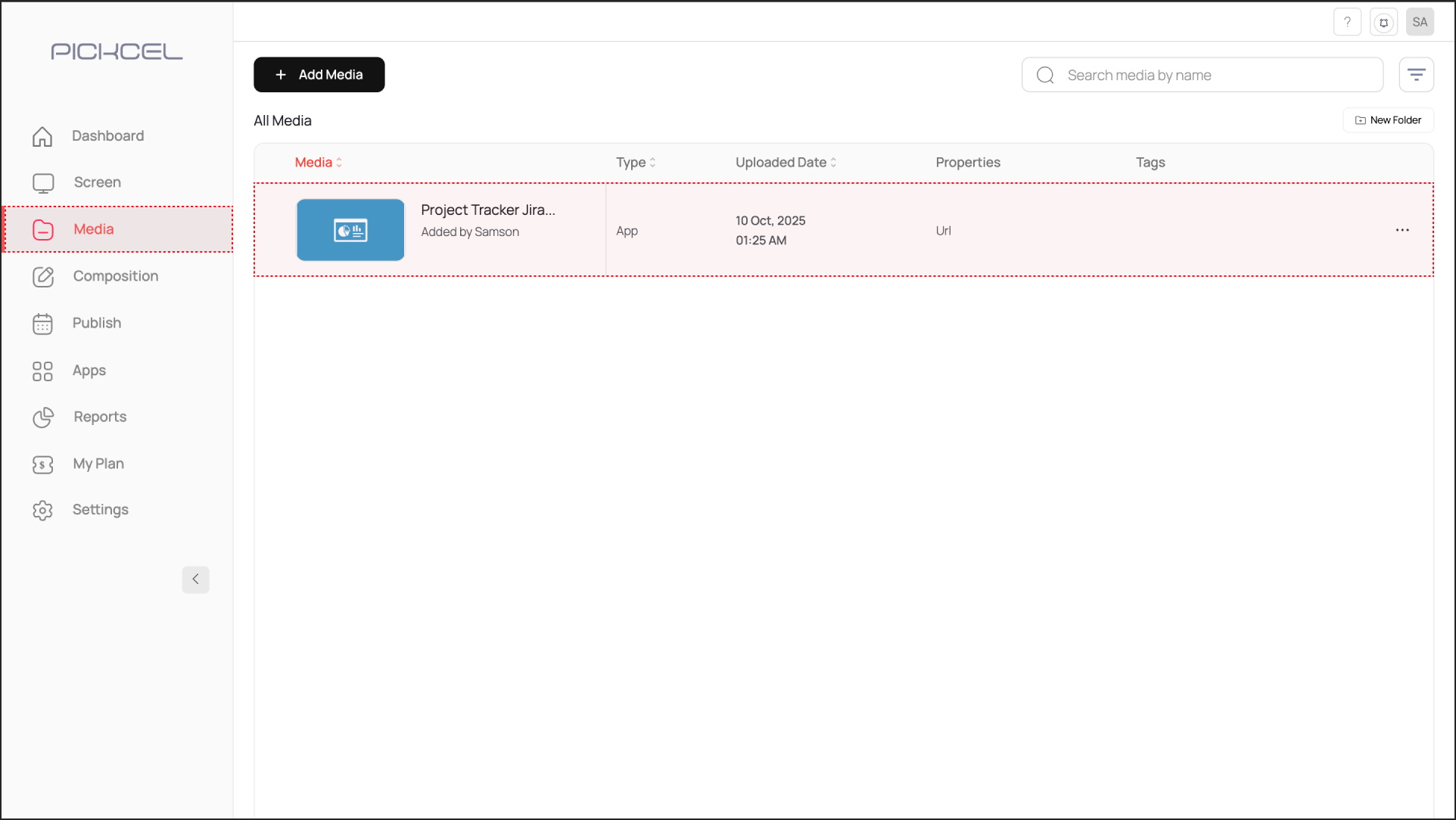- To preview the dashboard, go to Media, find the app instance by the name you created (e.g., "Project Tracker Jira Dashboard"), and click on its thumbnail (magnifier icon). This will display a preview. If you are content with the result, assign it to your digital signage screens.