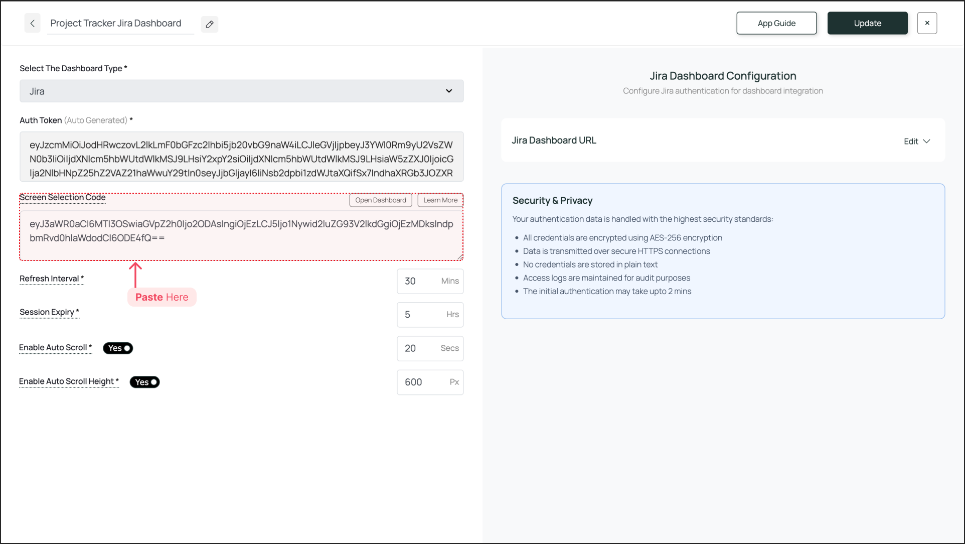 - Go back to your Dashboard App configuration in Pickcel Console and paste this code into the Screen Selection Code field.