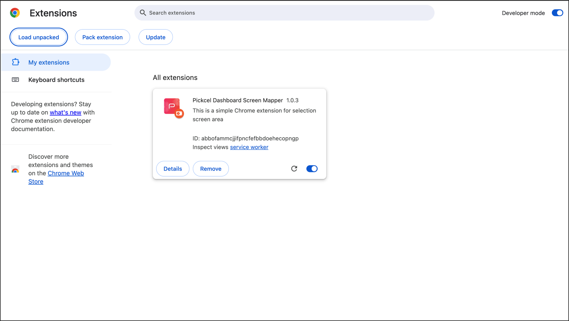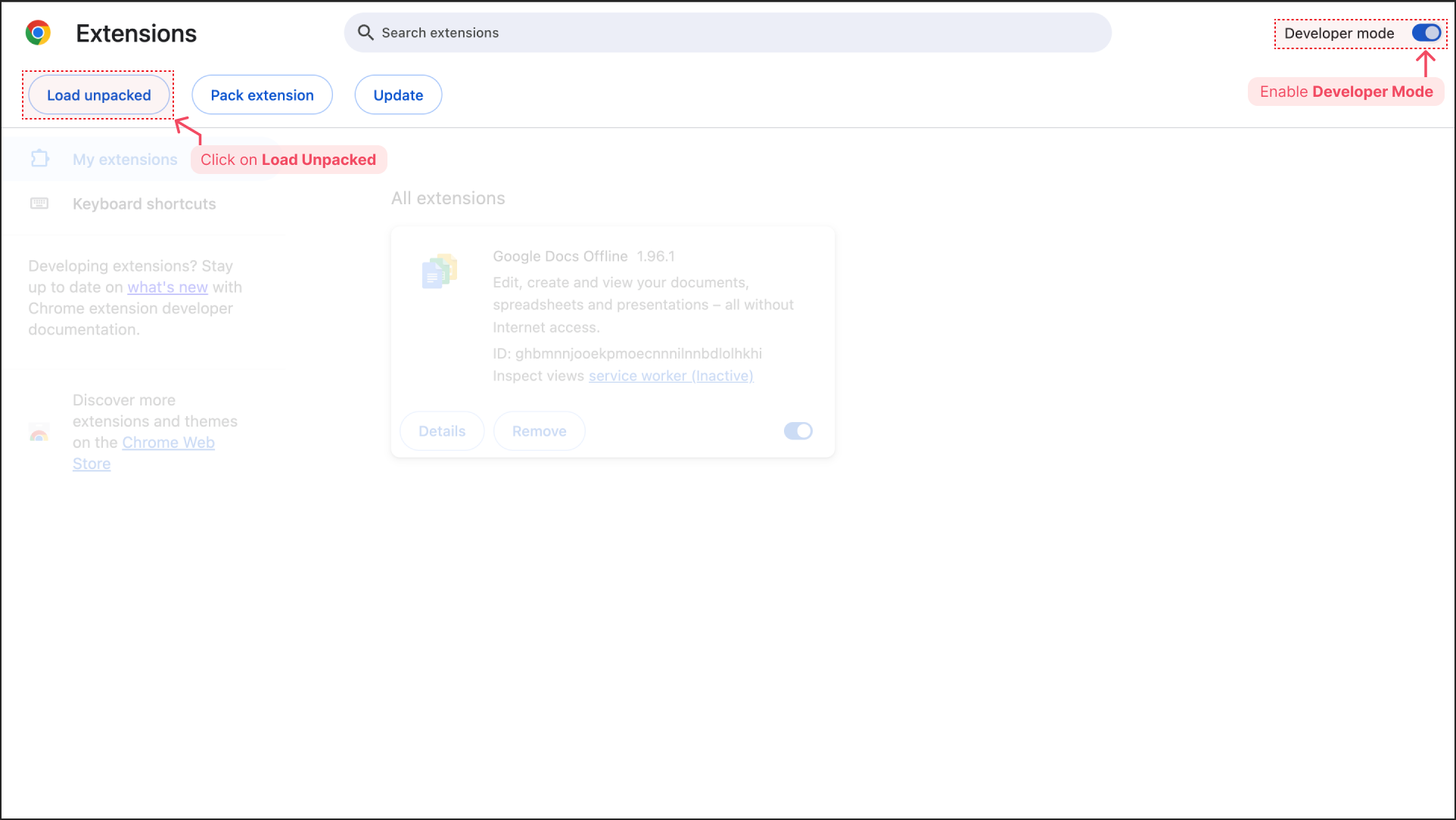 - In the top-right corner of the Extensions page, toggle on Developer mode. New buttons will appear. Click on Load unpacked.