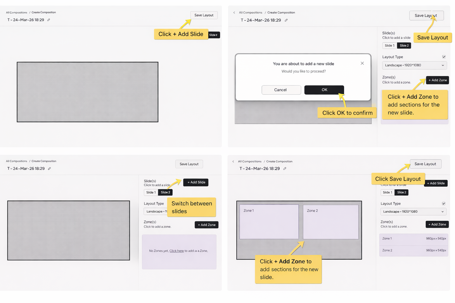 Each slide can have its own layout and zones. This helps you show different types of content in one composition without creating separate layouts.